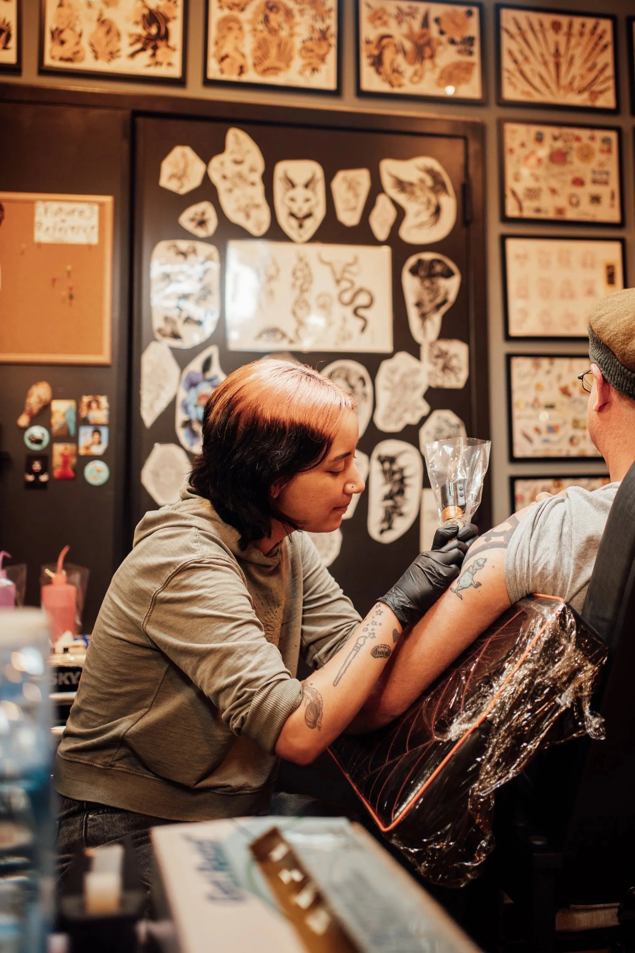 All tattoos are priced by the piece— based on size, detail and placement. There’s a $100 minimum for most small tattoos and body work is $150/hour. Check with your artist about payment. Some accept cash, others accept cashless payments.